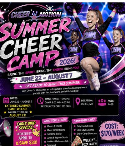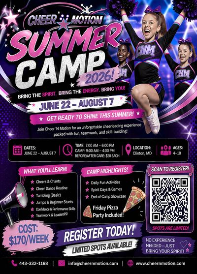 Founded by a former college, NBA, and NFL Professional Cheerleader with many years of coaching experience, Cheer 'N Motion is dedicated to fostering a love for cheerleading in a safe and positive environment. Our experienced coaches provide exceptional training in cheerleading and performance skills to help each member to reach their full potential.